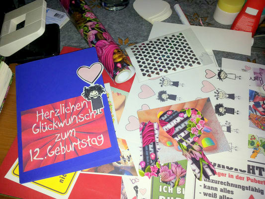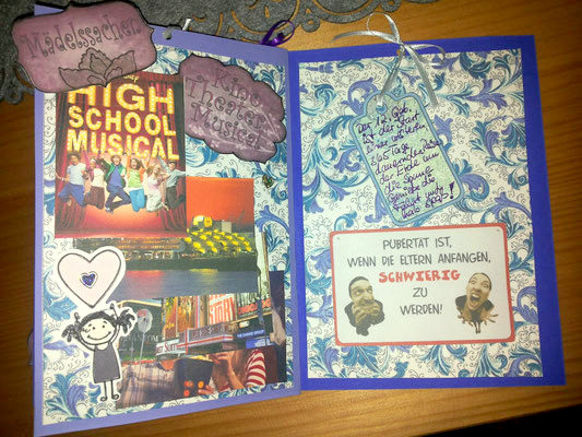 Ein Gutschein zum Geburtstag meiner Nichte war der Ursprung meiner Papiersucht. Eine Mischung aus 3D Technik mit Scrap Elementen, mit ganz viel Liebe zum Detail und vielen kleinen Gadgets. Alles in mühevoller Handbeit aus dem web zusammen gesucht,ausgedruckt, ausgeschnitten und aufgeklebt ... dekoriert mit Perlen, Fotos, Schleifenbändern, Strasssteinen ...